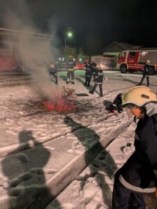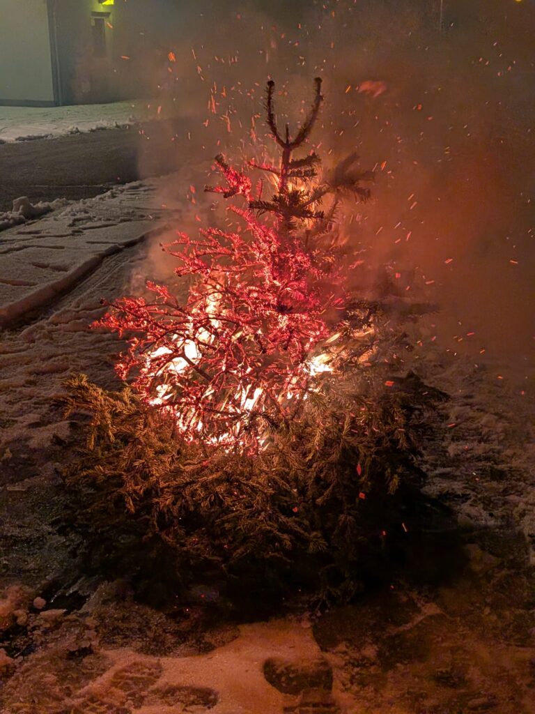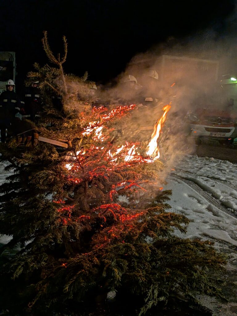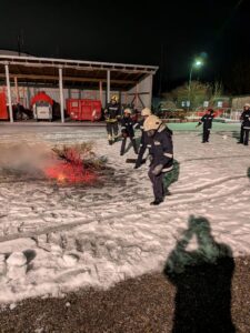 Anschließend wurden die Bäume von der Feuerwehrjugend unter Aufsicht fachgerecht gelöscht. Als besondere Spaßeinlage wurde ein Christbaum mit Schneebällen gelöscht, was für Begeisterung bei den Jugendlichen sorgte.